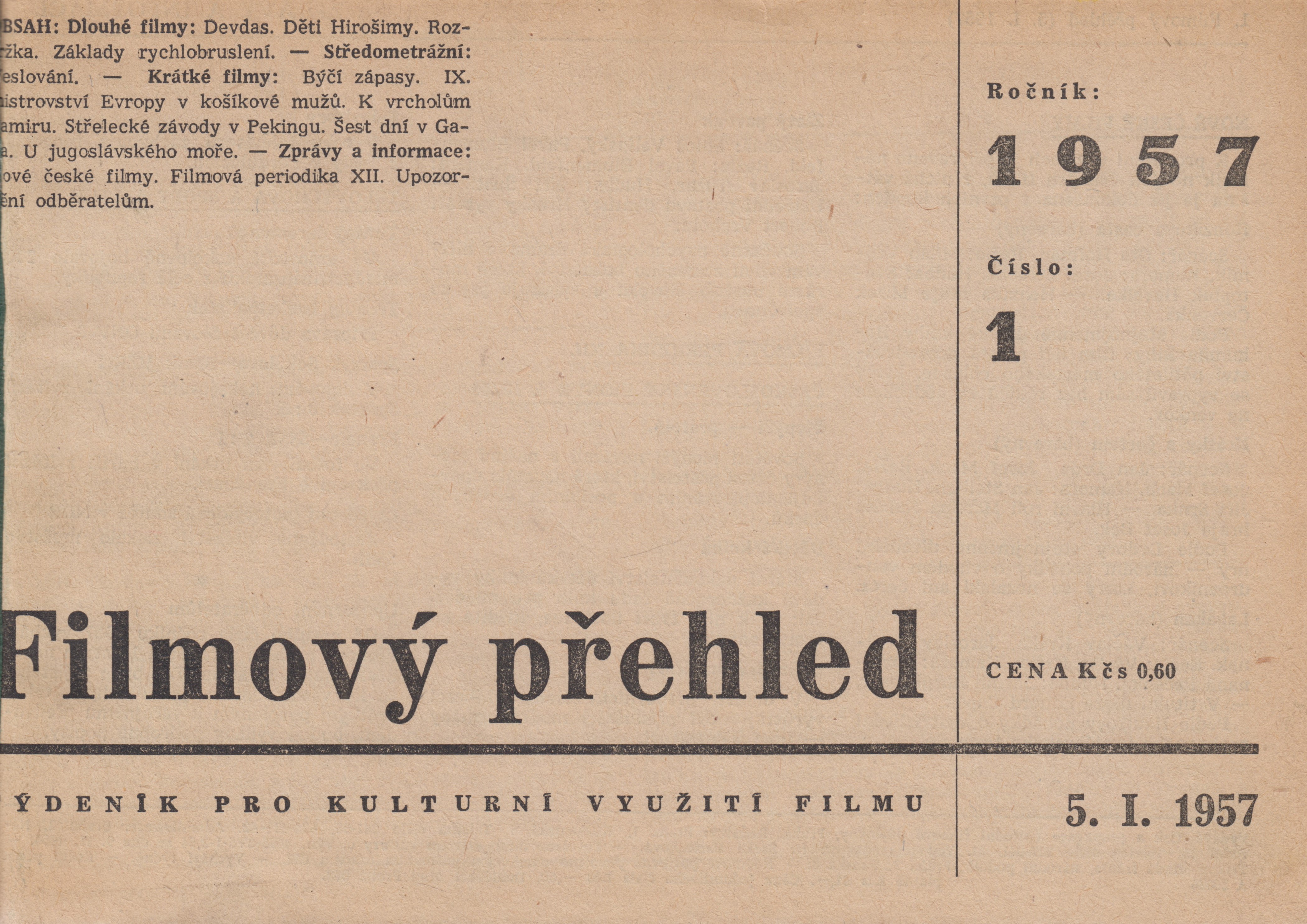 Název Filmový přehled Podnázev týdeník pro kulturní využití filmu Roč. a číslo [Roč. 8], č. 1 (05.01.1957)-52 (28.12.1957), 1957 Vyd.údaje Praha : Ústřední půjčovna filmů, 1957 Poznámky V tiráži uveden název vyd.: Tisk a propagace Ústřední půjčovny filmů (Praha), v některý číslech uvedeno: Ústřední filmové půjčovny. - Rejstřík 1957. - Týdně ISSN 0015-1645 Form.deskr. periodika filmová Systemat. 791.63, (051) Jazyk dok. cze - čeština Země vyd. CS - Československo Druh dok. BFI - Periodika filmová Katal.org. ABC135 - Knihovna Národního filmového archivu ID NFA (NFA-K)b-00032752 Počet ex. 2, z toho volných 0, prezenčně 2 Databáze xzrp - PERIODIKA - Svázaný ročník periodika Odkazy - PERIODIKA - Souborný záznam periodika (51) - PERIODIKA - Přijatá čísla (530) - ČLÁNKY Signatura Přír.číslo Lokace Dislokace CS Info 6691/1957 0085651 PRIR CIT6 pouze prezenčně 6691/1957-A 0038158 FOND HRAD pouze prezenčně