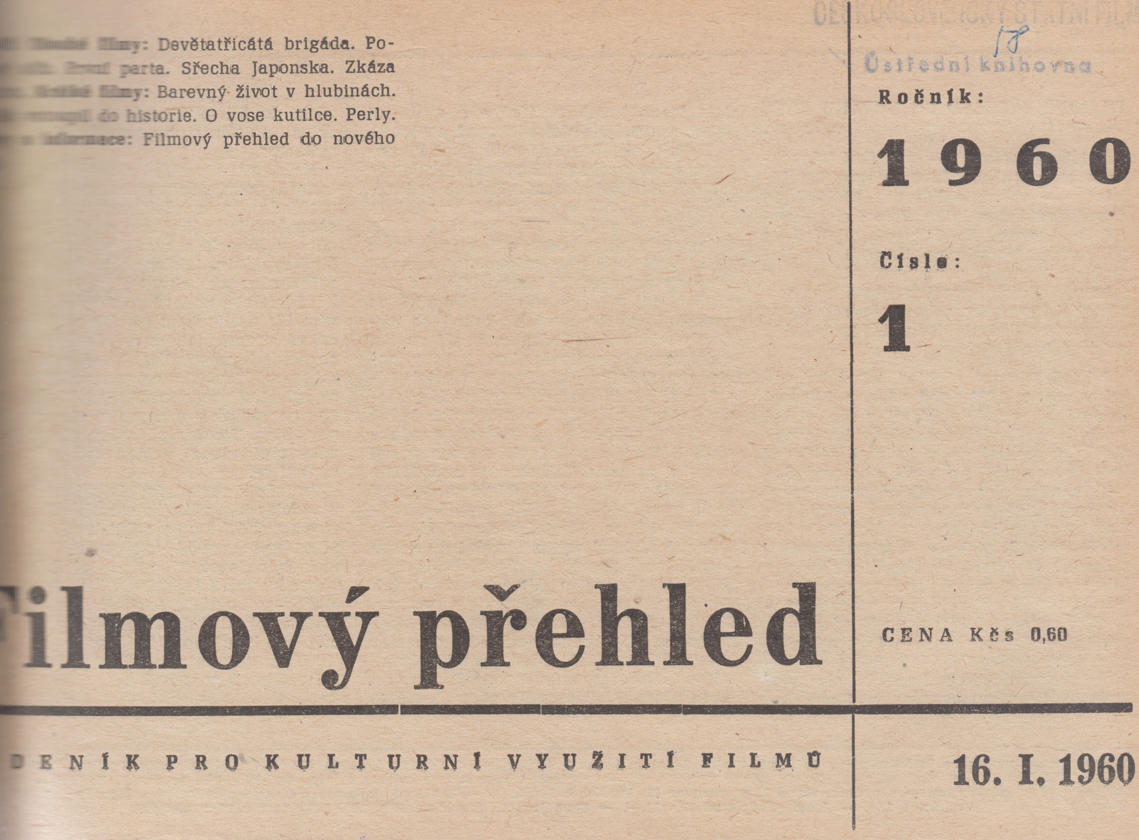 Název Filmový přehled Podnázev týdeník pro kulturní využití filmů Roč. a číslo [Roč. 11], č. 1 (16.01.1960)-51/52 (31.12.1960), 1960 Vyd.údaje Praha : Ústřední půjčovna filmů, 1960 Poznámky V č. 1-31 uveden název vyd.: Tisk a propagace Ústřední půjčovny filmů (Praha). - Rejstřík 1960. - Týdně ISSN 0015-1645 Form.deskr. periodika filmová Systemat. 791.63, (051) Jazyk dok. cze - čeština Země vyd. CS - Československo Druh dok. BFI - Periodika filmová Katal.org. ABC135 - Knihovna Národního filmového archivu ID NFA (NFA-K)b-00032755 Počet ex. 3, z toho volných 0, prezenčně 3 Databáze xzrp - PERIODIKA - Svázaný ročník periodika Odkazy - PERIODIKA - Souborný záznam periodika (152) - PERIODIKA - Přijatá čísla (1000+) - ČLÁNKY Signatura Přír.číslo Lokace Dislokace CS Info 6691/1960 0046610 FOND HRAD pouze prezenčně 6691/1960-A 0048310 FOND HRAD pouze prezenčně 6691/1960-B 0097394 PRIR CIT6 pouze prezenčně