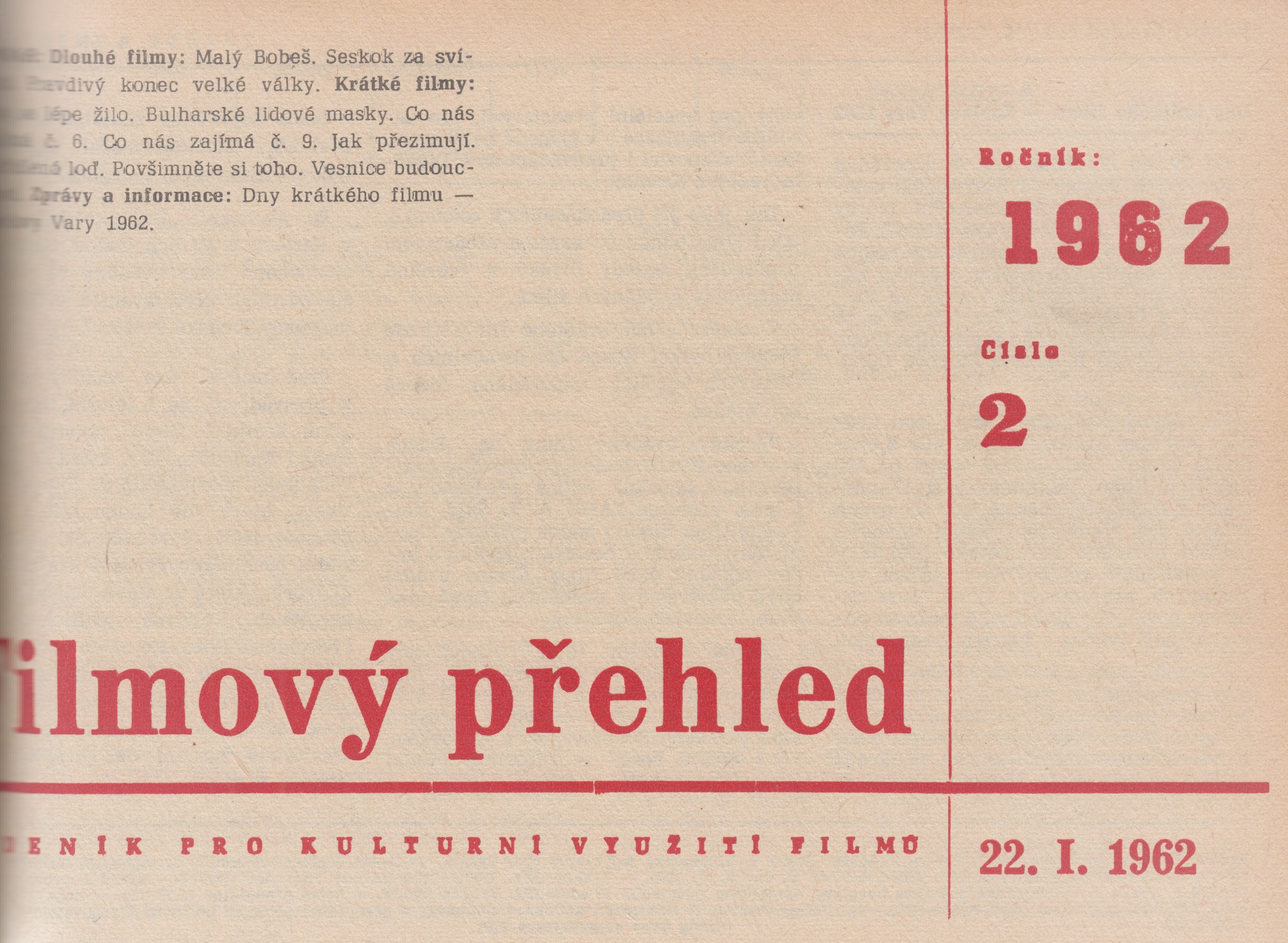 Title Filmový přehled Subtitle týdeník pro kulturní využití filmů Vol. and No. [Roč. 13], č. 1 (15.01.1962)-51/52 (07.01.1963), 1962-1963 Issue data Praha : Ústřední půjčovna filmů, 1962 Note Poslední č. ročníku (č. 51/52) vyšlo až v r. 1963. - Rejstřík 1962. - Týdně ISSN 0015-1645 Form. Descr. periodika filmová UDC 791.63, (051) Language cze - Czech Country CS - Czechoslovakia Doc. Kind BFI - Film periodicals Catal.org. ABC135 - Knihovna Národního filmového archivu NFA Control Number (NFA-K)b-00032757 Copy count 4, currently available 0, at library only 4 Database xzrp - PERIODIKA - Svázaný ročník periodika References - PERIODIKA - Souborný záznam periodika (51) - PERIODIKA - Přijatá čísla (641) - ARTICLES Signatura Přír.číslo Lokace Dislokace CS Info 6691/1962-A 0051878 FOND HRAD pouze prezenčně 6691/1962 0049996 PRIR CIT6 pouze prezenčně 6691/1962-B 0097396 FOND HRAD pouze prezenčně 6691/1962-C 0097397 FOND HRAD pouze prezenčně