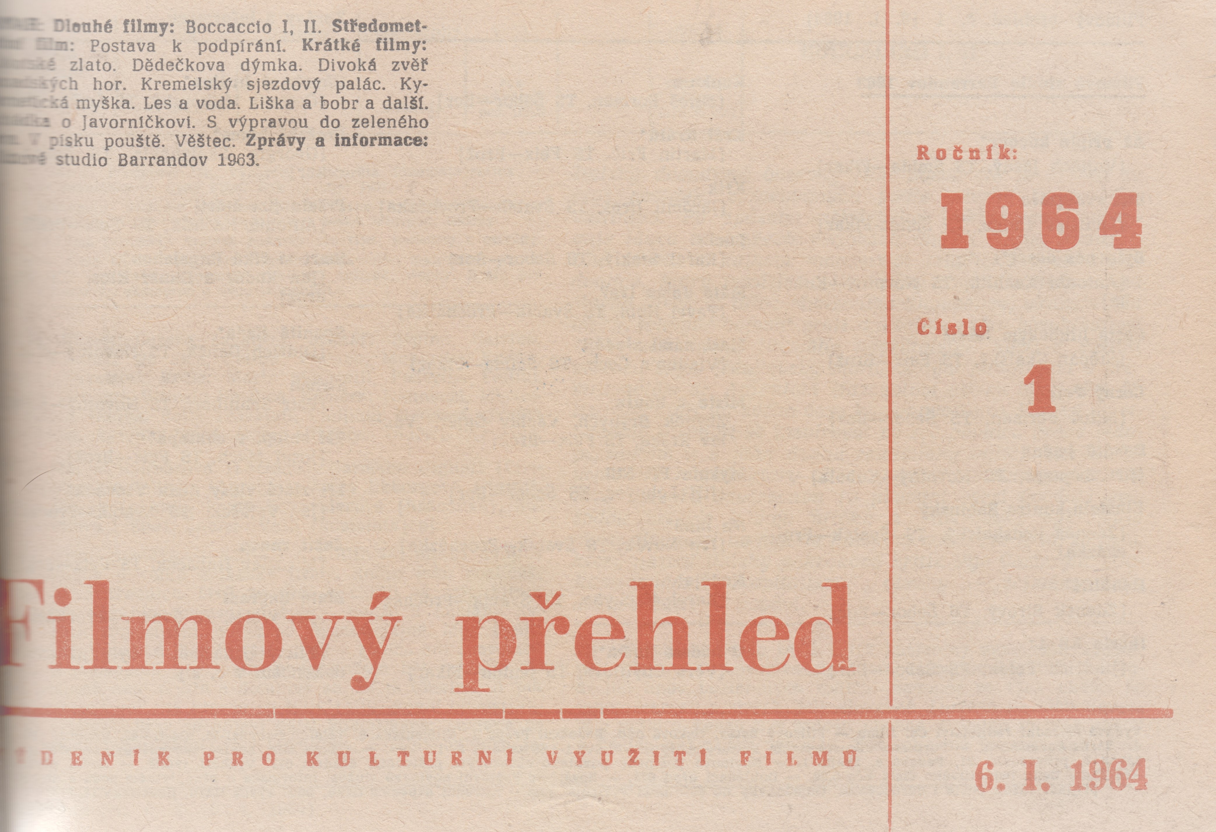 Název Filmový přehled Podnázev týdeník pro kulturní využití filmu Roč. a číslo [Roč. 15], č. 1 (06.01.1964)-51/52 (21.12.1964), 1964 Vyd.údaje Praha : Ústřední ředitelství Čs. filmu - Filmový ústav, 1964 Poznámky Rejstřík 1964. - Týdně ISSN 0015-1645 Form.deskr. periodika filmová Systemat. 791.63, (051) Jazyk dok. cze - čeština Země vyd. CS - Československo Druh dok. BFI - Periodika filmová Katal.org. ABC135 - Knihovna Národního filmového archivu ID NFA (NFA-K)b-00032759 Počet ex. 4, z toho volných 0, prezenčně 4 Databáze xzrp - PERIODIKA - Svázaný ročník periodika Odkazy - PERIODIKA - Souborný záznam periodika (46) - PERIODIKA - Přijatá čísla (659) - ČLÁNKY Signatura Přír.číslo Lokace Dislokace CS Info 6691/1964-A 0059213 PRIR CIT6 pouze prezenčně 6691/1964 0055726 FOND HRAD pouze prezenčně 6691/1964-B 0097386 FOND HRAD pouze prezenčně 6691/1964-C 0097387 FOND HRAD pouze prezenčně