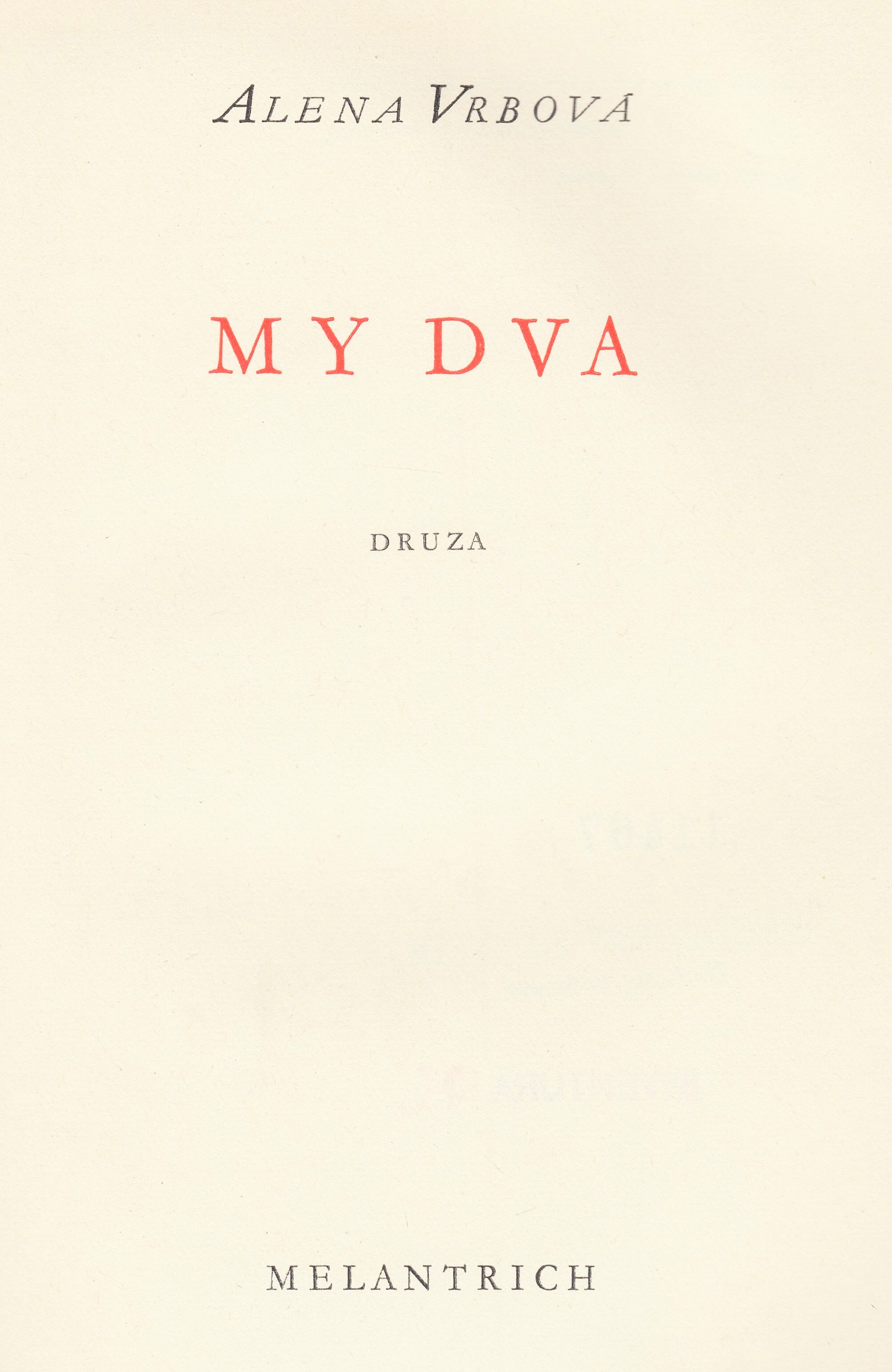 Název My dva Podnázev druza Aut.údaje Alena Vrbová Autor Vrbová Alena (1919-2004) Vydání Vyd. 1. Vyd.údaje V Praze : Melantrich, 1944 Fyzický popis - 220 s. Anotace Prozaický debut české básnířky Aleny Vrbové, ve kterém autorka experimentuje s literární formou. V řadě zdánlivě samostatných kapitol sleduje v průběhu jednoho dne příběh setkání chlapce a dívky a na tomto příběhu představuje svět mladých, jejich problémy a citové zrání. Za tuto knihu dostala cenu v literární soutěži nakladatelství Melantrich. ISBN (Váz. (dodatečně)) Form.deskr. novely Systemat. (0:82-32), 821.162.3-32 Jazyk dok. cze - čeština Země vyd. CS - Československo Druh dok. ABE - Beletrie Katal.org. ABC135 - Knihovna Národního filmového archivu ID NFA (NFA-K)b-00129864 Počet ex. 1, z toho volných 0, prezenčně 1 Databáze xxxk - Knihy Signatura Přír.číslo Lokace Dislokace CS Info 3039 0011467 FOND HRAD pouze prezenčně