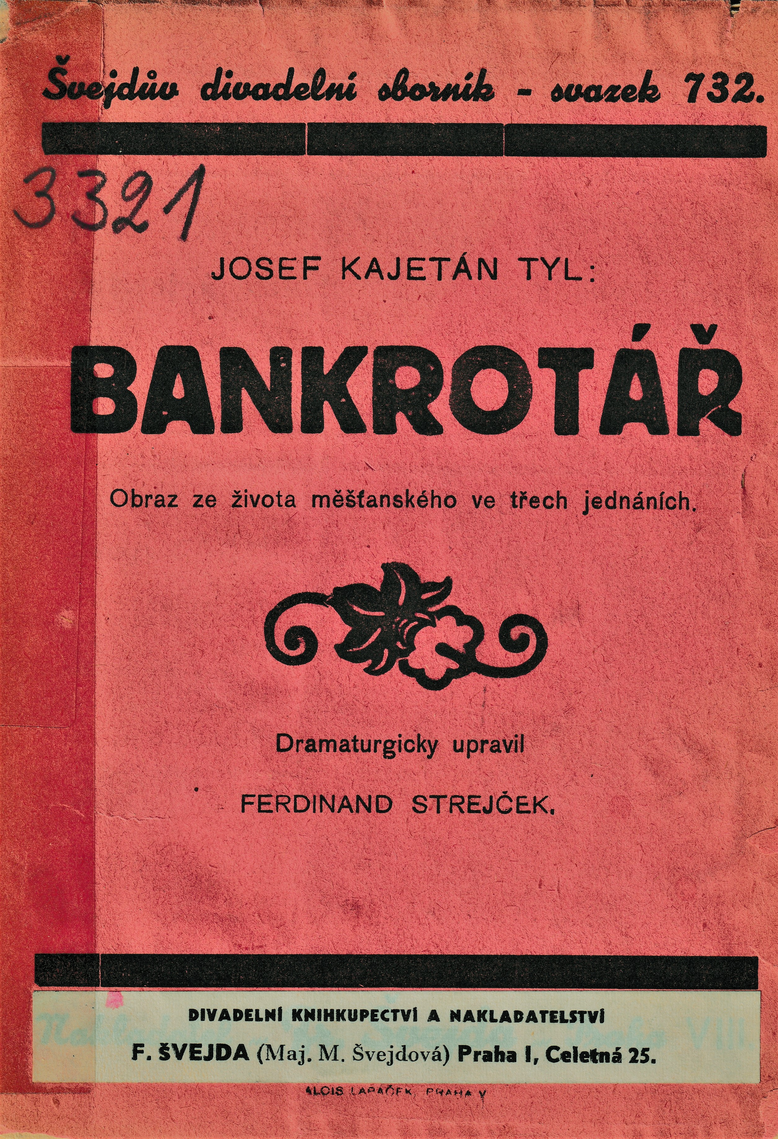Název Bankrotář Podnázev obraz ze života měšťanského ve třech jednáních Aut.údaje Josef Kajetán Tyl; dramaturgicky upravil Ferdinand Strejček Autor Tyl Josef Kajetán (1808-1856) Další autoři Strejček Ferdinand (1878-1963) Vyd.údaje V Praze : Fr. Švejda, [1931] Fyzický popis - 76 s. Edice Švejdův divadelní sborník sv. 732 Poznámky Úvod. - Osoby Anotace Divadelní hra J. K. Tyla Bankrotář ISBN (Sešit) Form.deskr. divadelní hry Systemat. 792, (0:82-2), 821.162.3-2 Jazyk dok. cze - čeština Země vyd. CS - Československo Druh dok. ADH - Divadelní hry Katal.org. ABC135 - Knihovna Národního filmového archivu ID NFA (NFA-K)b-00162286 Počet ex. 1, z toho volných 0, prezenčně 1 Databáze xxxk - Knihy Signatura Přír.číslo Lokace Dislokace CS Info 12460 0017465 FOND HRAD pouze prezenčně