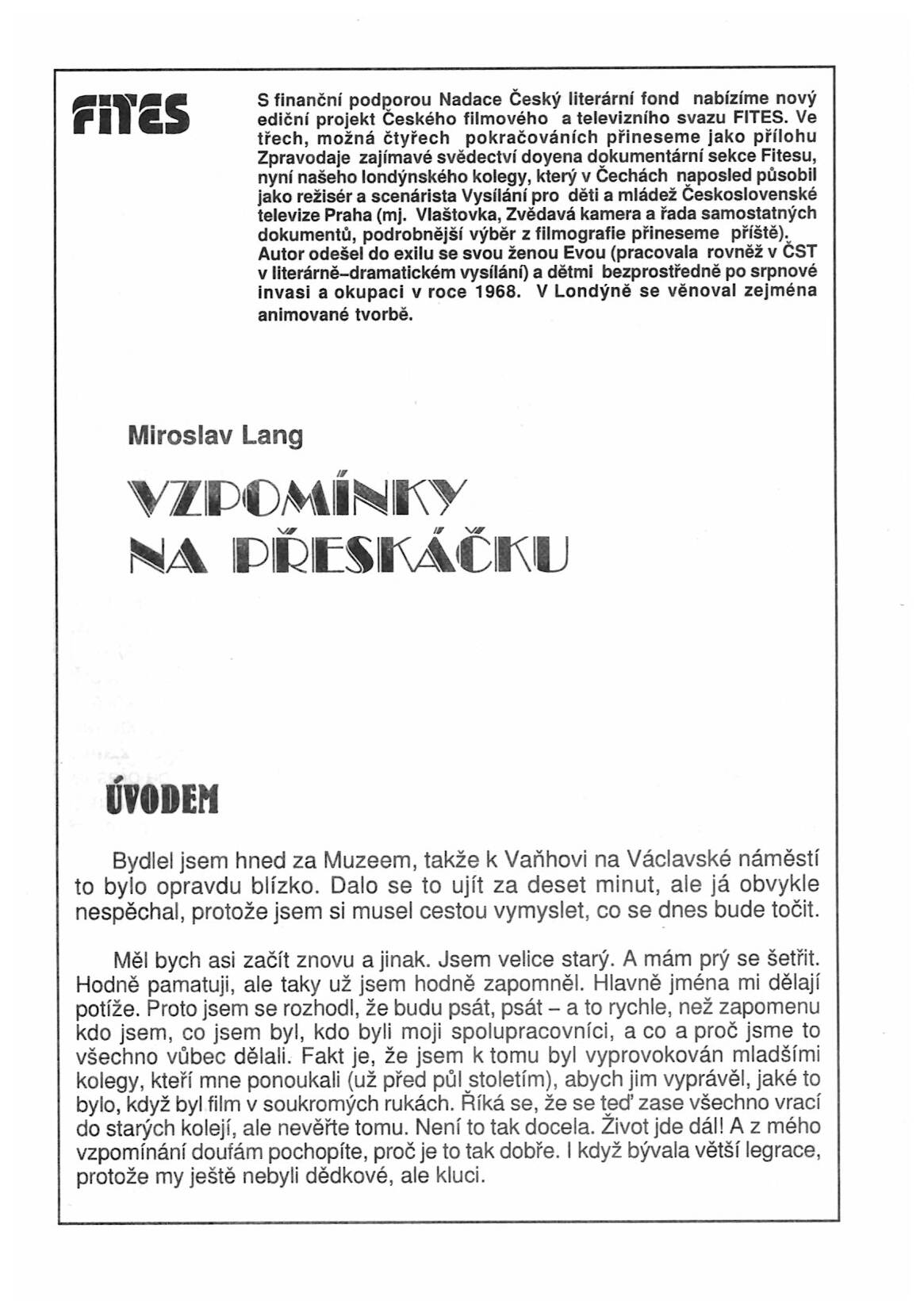 Vzpomínky na přeskáčku / Miroslav Lang. -- [Praha] : FITES, 2001. -- 4 sv. : il., portréty. -- Filmografie M. Langa ve 3. sv. - Dupl. B - volná čísla v deskách - Obsahuje: [1]. Vychází jako příloha Zpravodaje FITESU 1/2001. xvi s. - 2. Vychází jako příloha Zpravodaje FITESU 2/2001. [15] s. - 3. Vychází jako příloha Zpravodaje FITESU 3/2001. [15] s. - 4. Vychází jako příloha Zpravodaje FITESU 4/2001. [19] s. - Torzo vzpomínek českého dokumentaristy Miroslava Langa, které byly publikovány na pokračování jako příloha Zpravodaje FITESu v roce 2001. Po odchodu do emigrace v roce 1968 se věnoval ve Velké Británii tvorbě animovaných filmů. - Suplement k: Zpravodaj ... : Českého televizního svazu FITES. -- (Brož.)