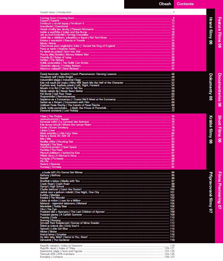 Title České filmy 2006-2007 Par.title Czech films 2006-2007 Subtitle katalog 2006 catalogue 2006 Author info [produkce katalogu Markéta Šantrochová, Jana Černík; překlady Martha Joy Sullivan] Author České filmové centrum (Praha, Česko) Issue data Praha : České filmové centrum, [2007] Physical description - 127 s.: většinou barev. il., portréty Note Souběžný anglický text. - Údaje převzaty z obálky a tiráže. - Autorka úvodu Jana Černík. - Adresáře, filmografie v textu. - Rejstřík režisérů a filmů podle českých a anglických názvů Annotation Dvoujazyčný katalog českých filmů vyrobených, promítaných a připravovaných v letech 2006 a 2007. Každý film obsahuje základní technické údaje, obsah, barevnou fotografii a stručnou biofilmografii režiséra s portrétní fotografií. Na konci publikace je připojen žebříček návštěvnosti českých i zahraničních filmů v české distribuci. ISBN (Brož.) Corporation keywords České filmové centrum Keywords produkce. Česko. 2006-2007 * produkční filmové společnosti a studia. Česko. 2006-2007 * filmové organizace. Česko. 2006-2007 Form. Descr. katalogy, ročenky, propagační publikace UDC 791.63(437.3)"2006/2007", 791.53(437.3)"2006/2007", (083.81), (058), (085) Language cze - Czech, eng - English Language of the original cze - Czech Country CZ - Czech Republic Doc. Kind ARO - Yearbooks Catal.org. ABC135 - Knihovna Národního filmového archivu NFA Control Number (NFA-K)b-00105414 Copy count 3, currently available 0, at library only 3 Database xxxk - Books Info e-document is available for registered users only Call number Track No. Location Sublocation CS Info 36646/2006-2007 0103121 FOND HRAD In-Library Use Only 36646/2006-2007-A 0103122 FOND HRAD In-Library Use Only 36646/2006-2007-B 0112448 FOND HRAD In-Library Use Only