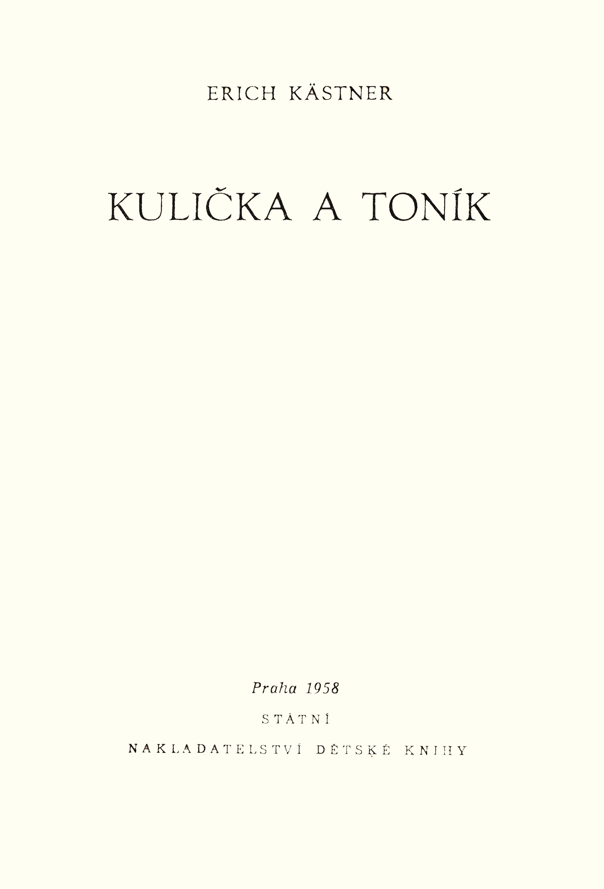 Title Kulička a Toník Author info Erich Kästner; [z německého původního vydání ... přeložila Jitka Fučíková, ilustroval Walter Trier] Author Kästner Erich (1899-1974) Další autoři Fučíková Jitka (1903-1987) Trier Walter (1890-1951) Issue 1. vyd. v SNDK Issue data Praha : Státní nakladatelství dětské knihy, 1958 Edition Knihy odvahy a dobrodružství sv. 21 Original Pünktchen und Anton / Kästner Erich (1899-1974) . Zürich : Atrium Verlag, 1955. Annotation Knížka známého německého autora o dobrodružstvích děvčete Kuličky a chlapce Toníka. Přátelství těchto dětí je založeno na rozdílnosti jejich povah. Toník je přitahován Kuliččinou obrazotvorností a živostí. Kulička obdivuje Toníkovu rozvahu a praktičnost. Každou kapitolu knihy uzavírá autor srozumitelnými a vtipnými výchovnými úvahami. ISBN (Váz. (dodatečně)) Form. Descr. publikace pro děti, vyprávění UDC 821-93, (0:82-3), 821.112.2-3 Language cze - Czech Language of the original ger - German Country DE - Germany Doc. Kind ADE - Children’s literature Catal.org. ABC135 - Knihovna Národního filmového archivu NFA Control Number (NFA-K)b-00137148 Copy count 1, currently available 0, at library only 1 Database xxxk - Books Příběhy obyčejných šílenstvíSignatura Přír.číslo Lokace Dislokace CS Info 8042 0036634 FOND HRAD pouze prezenčně