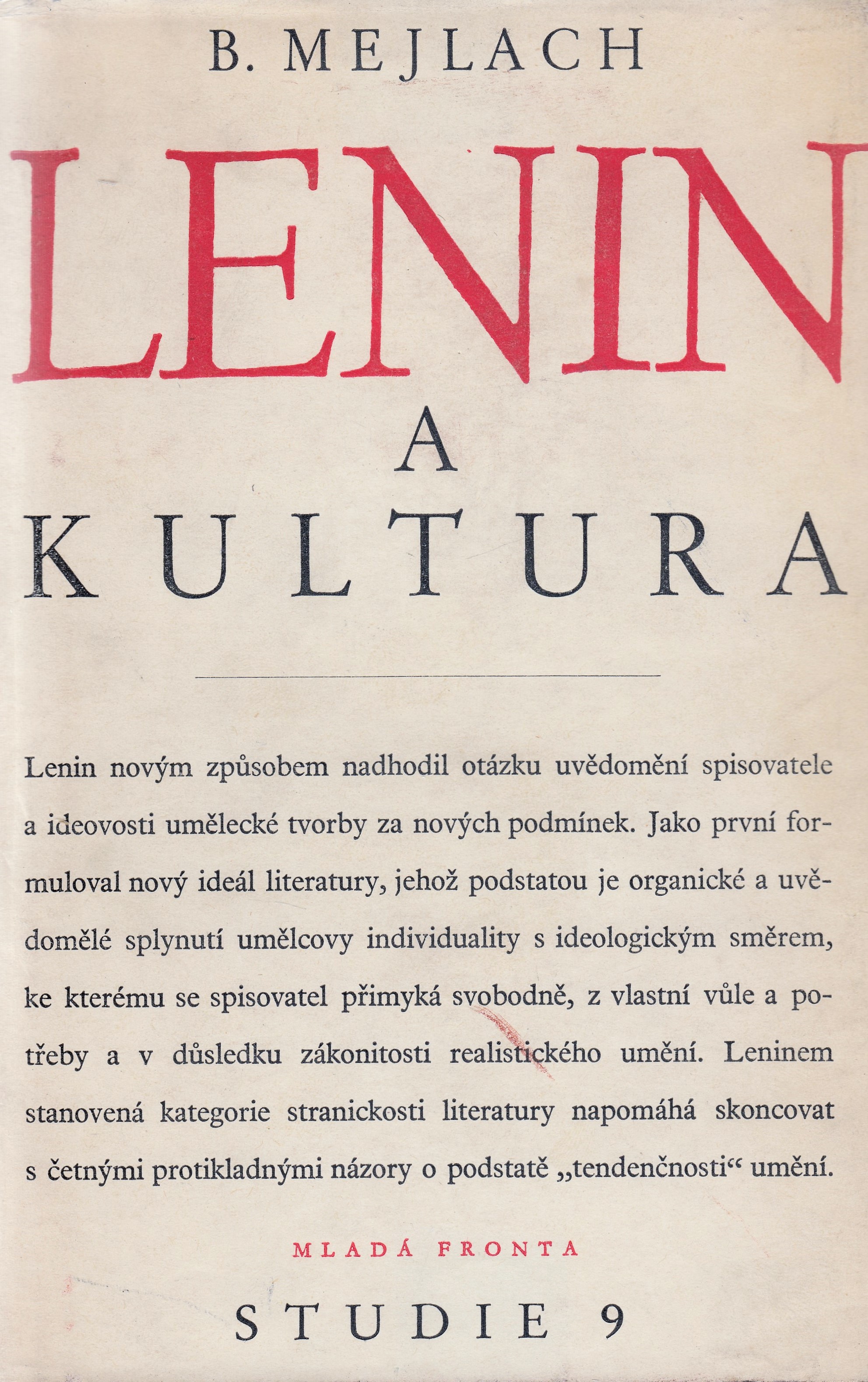 Title Lenin a kultura Subtitle Lenin a problémy ruské literatury konce XIX. a začátku XX. století Author info B. Mejlach; přeložila Jiřina Pokorná, básně přeložil Vlastimil Brtěk Author Mejlach Boris Solomonovič (1909-1987) Další autoři Brtěk Vlastimil (1924-) Issue 1. vyd. Issue data V Praze : MF, 1948 Physical description - 380 s. Edition Studie sv. 9 Original Lenin i problemy russkoj literatury konca XIX. - i načala XX. veka / Mejlach Boris Solomonovič (1909-1987) Note Přeloženo z ruštiny. - Poznámky pod čarou. - Bibliografické odkazy Annotation B. Mejlach ve své studii probírá Leninův poměr k literatuře v nejužší spojitosti s jeho veškerou činností a veřejným životem. Věnuje se např. otázkám literatury a kultury v období revoluce, literárně-estetickým otázkám či Leninovým článkům o L. N. Tolstém. ISBN (Váz.) Person keywords Lenin Vladimír Iljič (1870-1924) Tolstoj Lev Nikolajevič (1828-1910) Keywords spisovatelé * kultura * politici. Rusko. Sovětský svaz * kultura a společnost Form. Descr. studie UDC 32-051(47+57), 821.161.1-051, 316.7, 316.72/.75, 82.09, (048.8) Language cze - Czech Language of the original rus - Russian Country CS - Czechoslovakia Doc. Kind ASD - Studies Catal.org. ABC135 - Knihovna Národního filmového archivu NFA Control Number (NFA-K)b-00207525 Copy count 1, currently available 0, at library only 1 Database xxxk - Books Call number Track No. Location Sublocation CS Info 1883 0004992 FOND HRAD In-Library Use Only