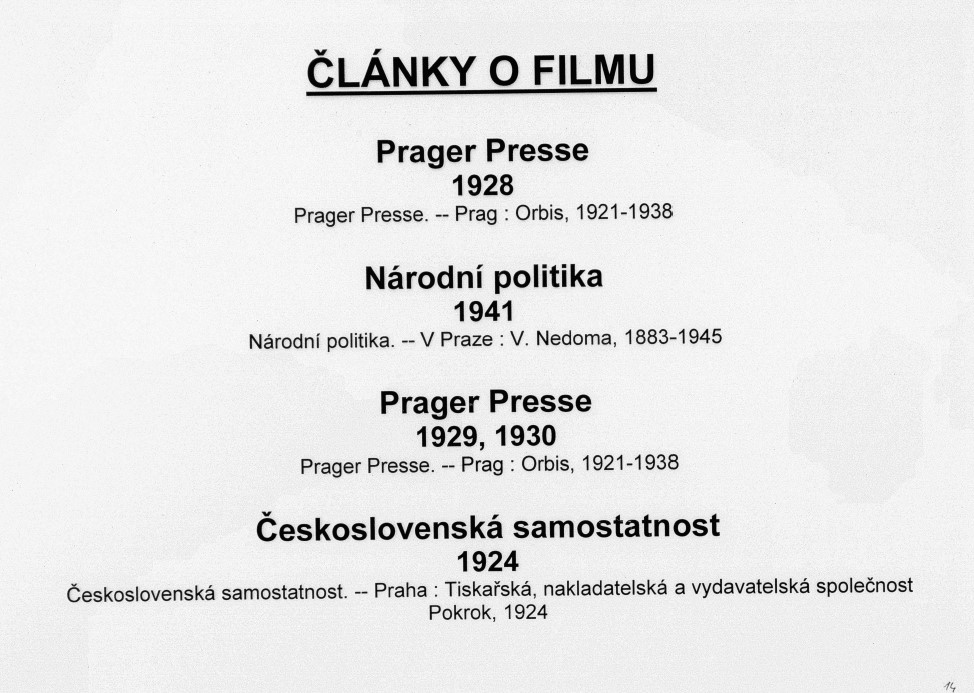 1. TitleČlánky o filmu [mikrodokument]. Prager Presse - 1928, 1929, 1930. Národní politika - 1941, 1944, 1943. Československá samostatnost - 1924. Národní osvobození 1924, 1925, 1930, 1929. České slovo -1944. Právo lidu - 1925. Výtečný sklepník [rukopis] - 1906. - 34 s.